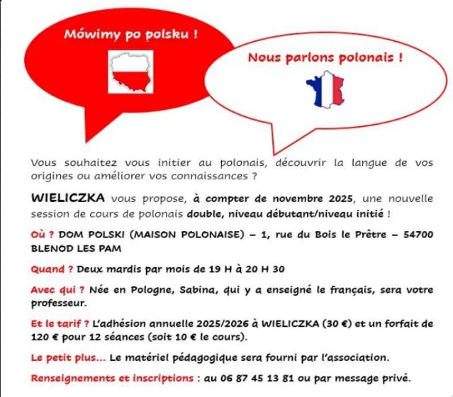 Les premiers cours auront lieu les mardis 4 et 18 novembre 2025, de 19 H à 20 H 30, à notre DOM POLSKI (Maison Polonaise) - 1, rue du Bois le Prêtre - 54700 BLENOD LES PAM.