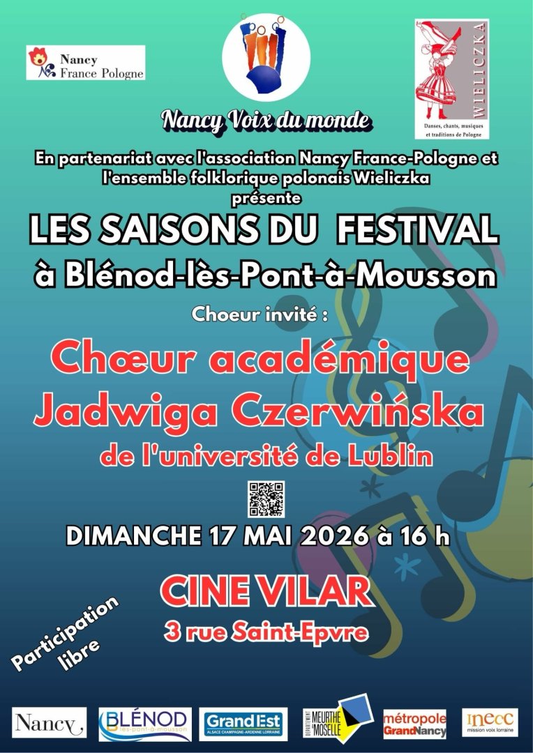 Le 𝗱𝗶𝗺𝗮𝗻𝗰𝗵𝗲 𝟭𝟳 𝗺𝗮𝗶 𝟮𝟬𝟮𝟲 à 𝟭𝟲𝗵, le festival Les Saisons du Festival accueillera le 𝗖𝗵oe𝘂𝗿 𝗮𝗰𝗮𝗱𝗲́𝗺𝗶𝗾𝘂𝗲 𝗝𝗮𝗱𝘄𝗶𝗴𝗮 𝗖𝘇𝗲𝗿𝘄𝗶𝗻́𝘀𝗸𝗮 𝗱𝗲 𝗹'𝗨𝗻𝗶𝘃𝗲𝗿𝘀𝗶𝘁𝗲́ 𝗱𝗲 𝗟𝘂𝗯𝗹𝗶𝗻, invité par Nancy Voix du Monde en partenariat avec Nancy France Pologne et l'ensemble folklorique Wieliczka.