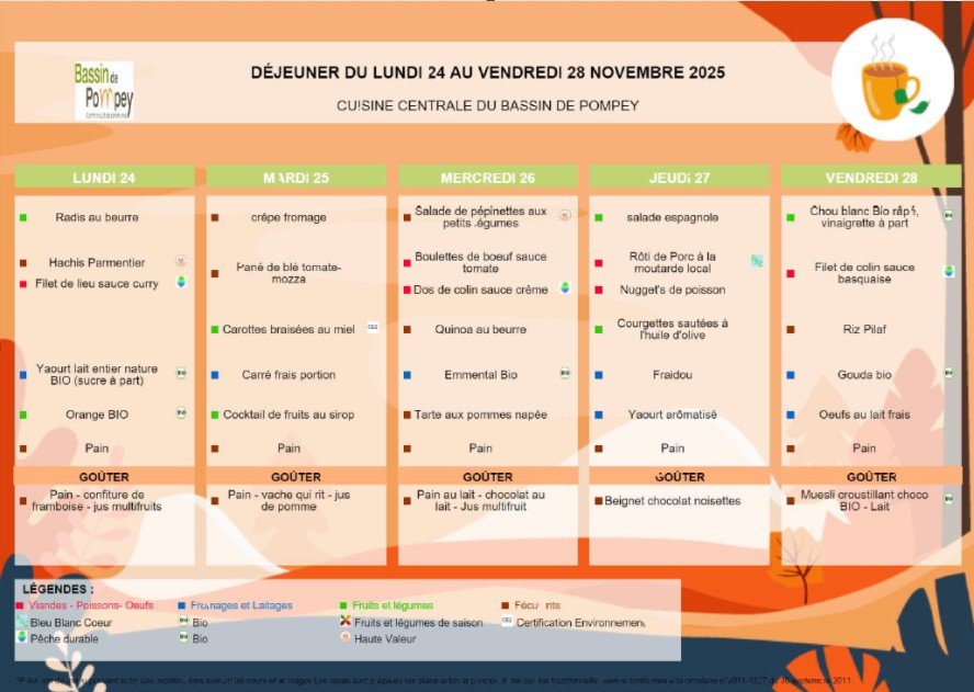 Sur réservation au plus tard à 12h le mardi de la semaine précédente pour toute la semaine suivante (changement possible uniquement sur le plat) par tél : 03 83 80 43 25
